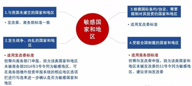 需要注意的是:ODI根据投资金额大小、行业、国家等因素,分为备案制和核准制。如果是涉及敏感行业,无论项目投资金额大小,一律提交商务部和发改委进行核准。关于敏感地区和敏感行业的界定,详见下图: