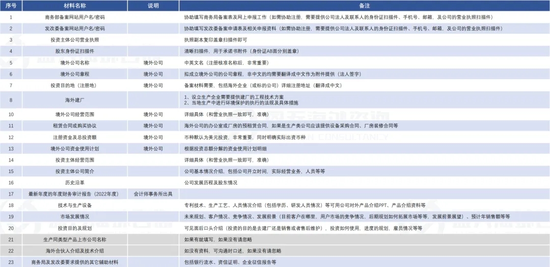 发改委审核文件 1. 投资主体注册登记证明文件; 2. 追溯至最终实际控制人的投资主体股权架构图; 3. 最新经审计的投资主体财务报表; 4. 投资主体投资决策文件; 5. 具有法律约束力的投资协议或无投资协议情况说明(并购、合资等项目需提交); 6. 证明投资资金来源真实合规的支持性文件; 7. 境外投资真实性承诺书; 8. 投资主体公共信用信息报告; 9. 《投资主体公司章程或合伙协议》等; 10. 其他相关协议、报告、说明等(如有)。 第三方出具的材料以第三方中介机构盖章为准。