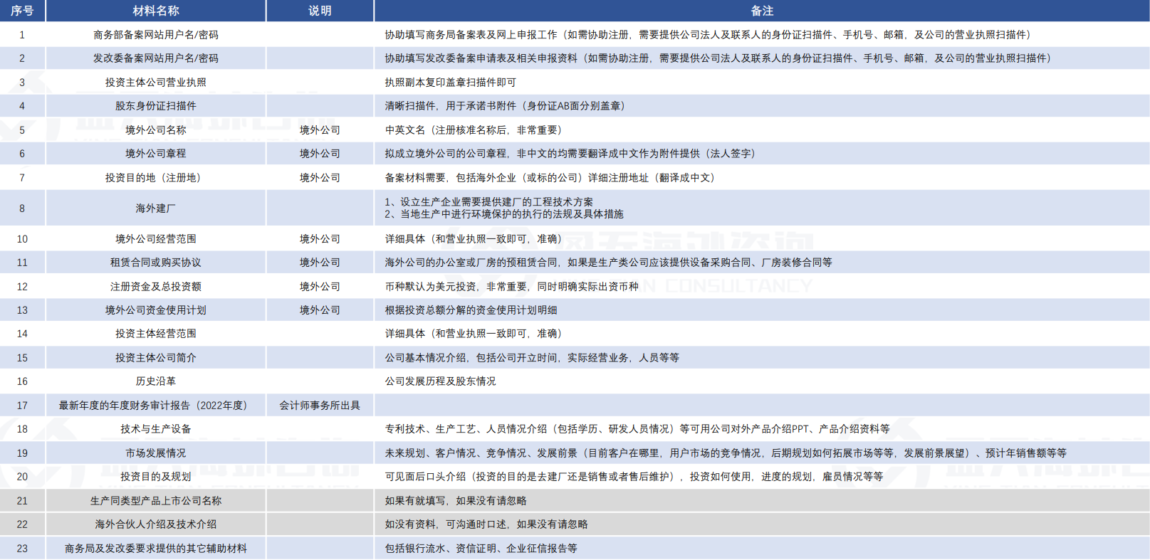 ![]() | 1. 商务部备案申请表 2. 营业执照复印件盖章扫描件 3. 股东会决议(董事会决议) 4. 境外投资前期工作说明 5. 境外投资可行性研究报告 6. 资金来源情况说明 7. 投资环境评价分析 8. 境外投资真实性承诺书 9. 海外公司章程 10. 境外安全生产管理规定 11. 应急预案 12. 银行流水 13. 商务部门要求提供的材料(例如:合资协议) ODI并购还需要准备尽职调查报告、资产评估报告、并购前期事项报告、股权收购协议等其他支撑材料 |
